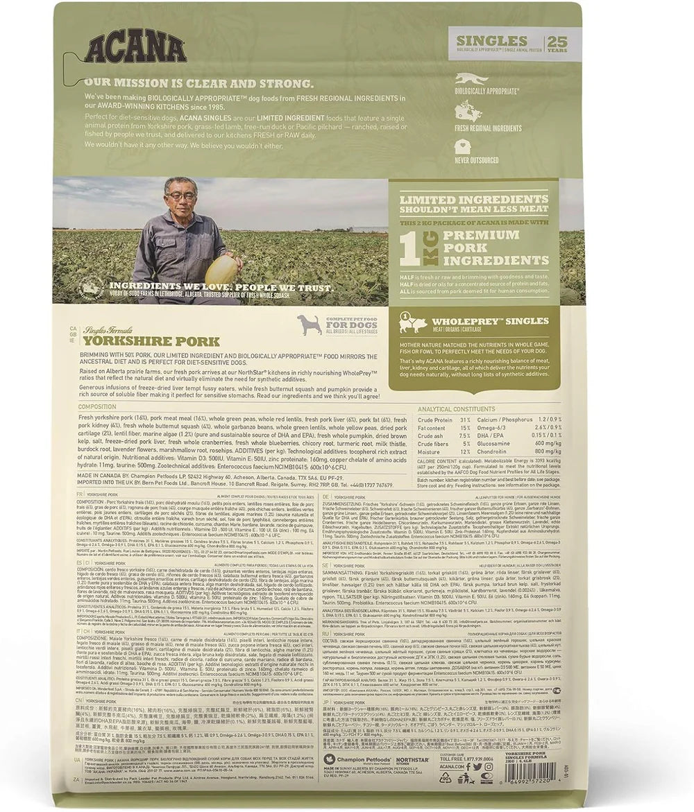 Limited ingredient doesn’t mean less meat. ACANA™ Singles Yorkshire Pork is loaded with quality pork ingredients in WholePrey ratios, complemented with whole, delicious butternut squash, providing your dog with the protein, nutrients, and fibre they need in order to stay happy, healthy, and strong.