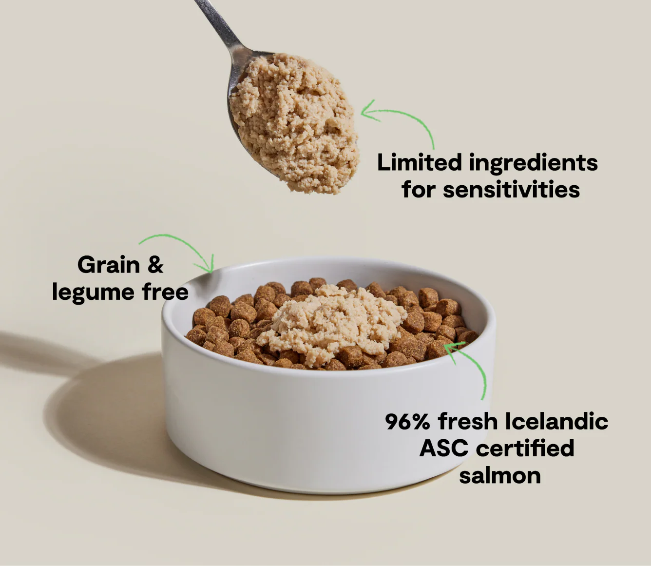 Crafted with 96% fresh Icelandic salmon, this silky mousse is a delicious and nutritious way to add instant texture and variety to your dog's bowl.