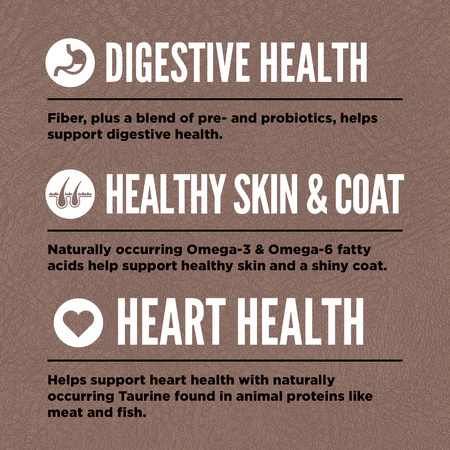 - 85%* quality animal ingredients from beef, whole pilchard, bison and lamb, providing a strong source of essential protein, vitamins, and minerals. *Approximate and derived from the unprocessed state of the ingredients.