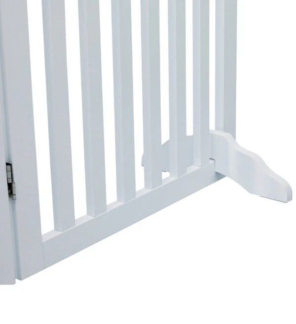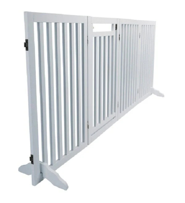 The TRIXIE Freestanding 4-Panel Convertible Pet Gate provides a practical way to limit your pet's access around the house. The gate fits room and hallway openings from 40" to 80". Our unique design allows the unit to convert into a 2.78 sq. ft. pen, room divider, and dog gate as your pet grows. A walk-thru door makes it easy to go from room to room. Built with solid, sustainable wood, and durable as well as beautiful. The accordion-style panels can be placed anywhere between 90 and 180 degrees. Non-slip rubber feet are provided to keep the gate in place and protect floors and carpet. Each panel is 60-160 cm wide by 81 cm tall.