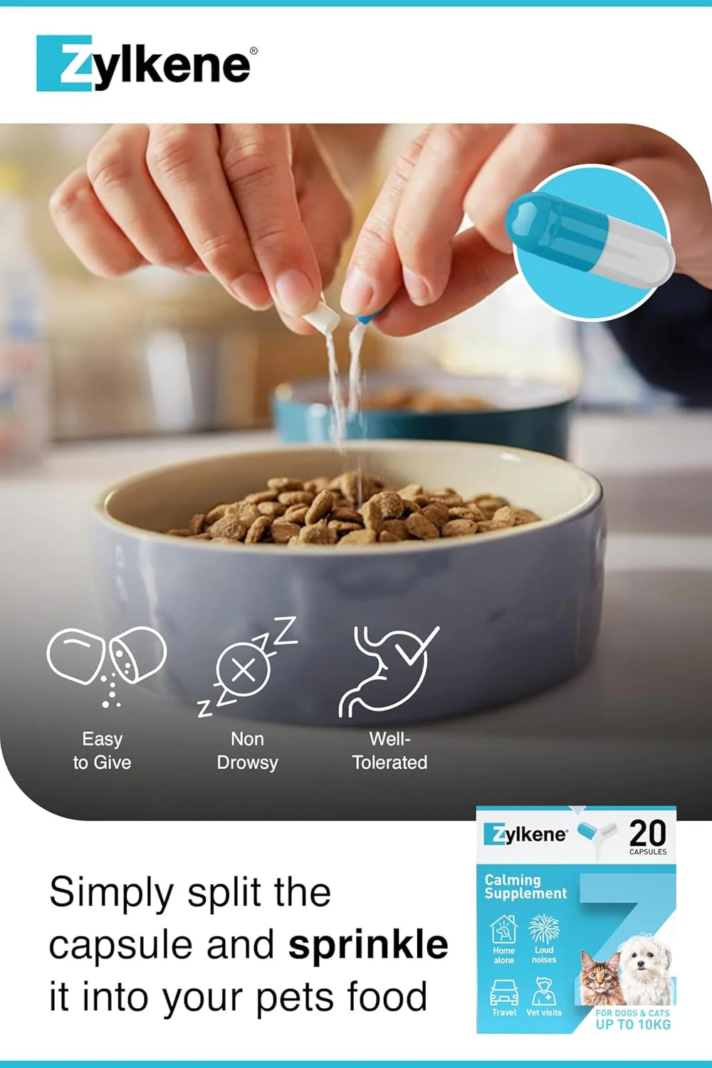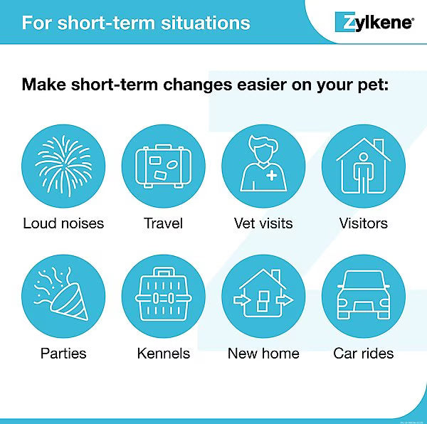 - New places. Whether a pet is visiting the groomer, the vet, or moving to a new home, Zylkene can help them stay calm as they adjust to new environments. It is clinically proven to help pets cope with challenging situations without drowsy side effects.
