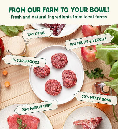 The taste of the beef menu will drive your canines crazy. This food is a balanced and complete raw food meal, made with all natural and fresh ingredients, direct from local farms and orchards, so that your dog is fed in the most natural way possible.